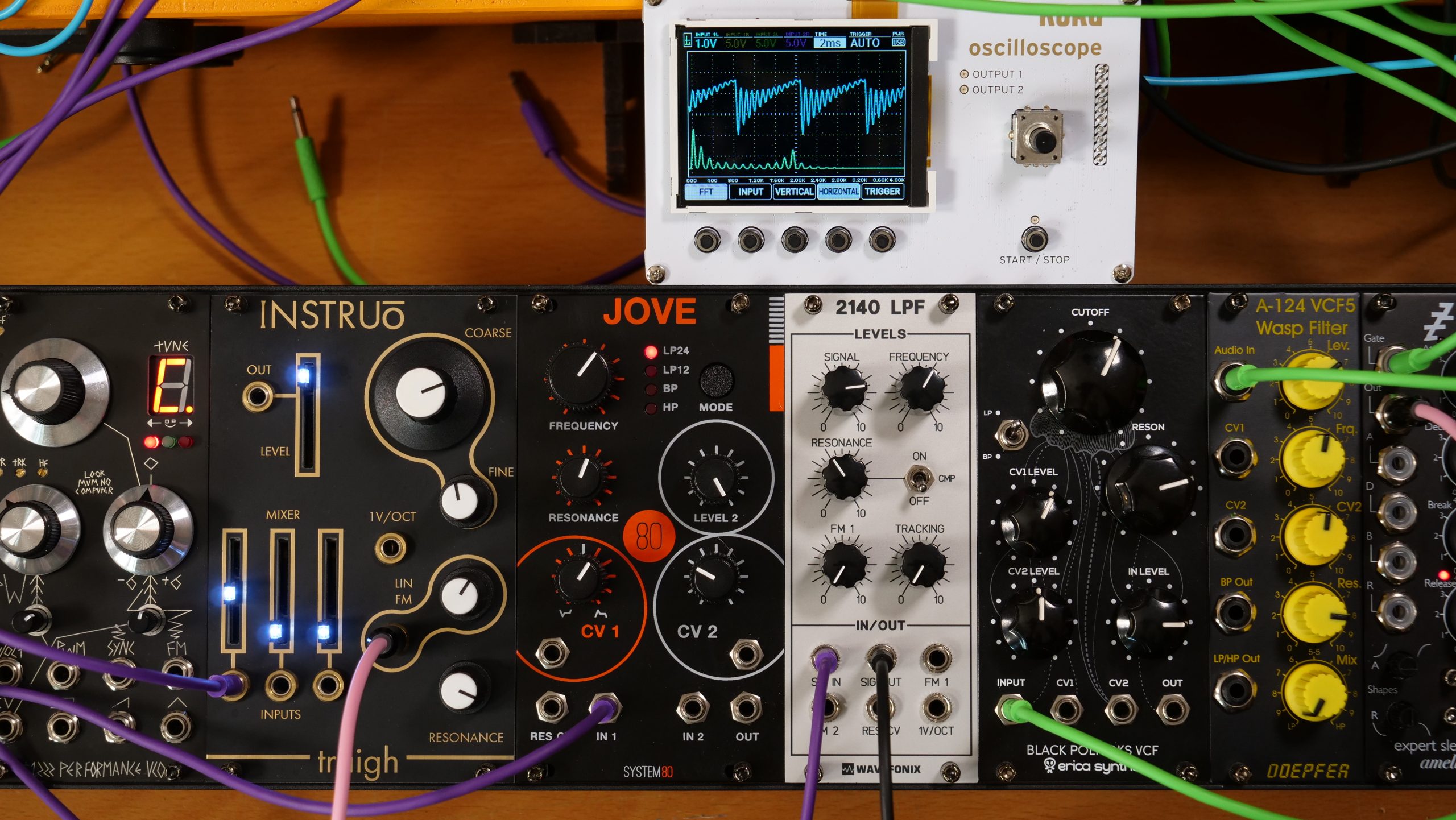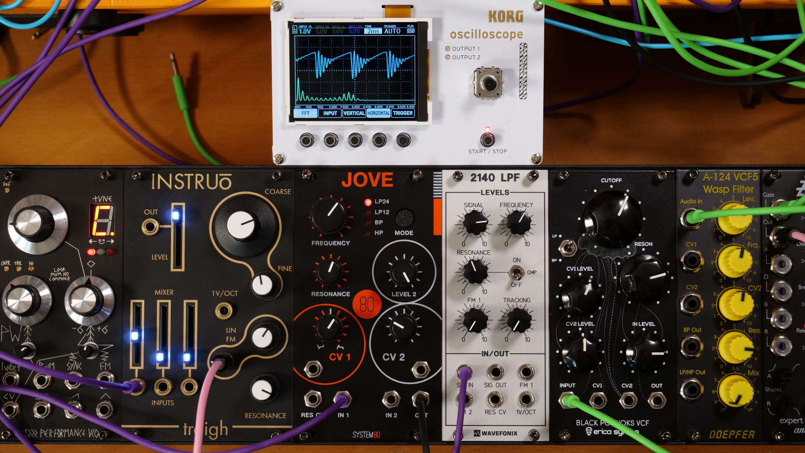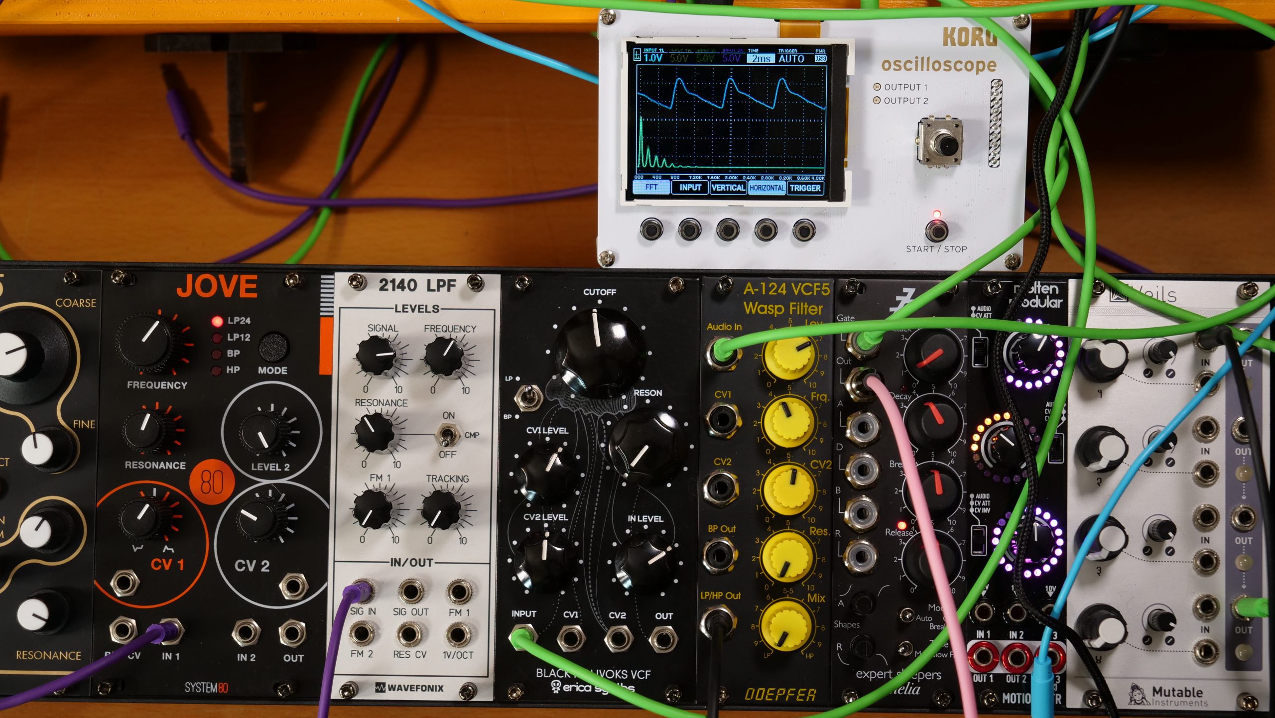 First, I ran through a static sawtooth wave and observed what happened as I moved the cut-off and resonance knobs. Then I patched an envelope to the cut-off and routed a sequence to the same sawtooth oscillator. The filters in question were the Instruo Traigh ladder filter, the System80 Jove Jupiter-6 filter, the Wavefonix 2140 OTA filter, the Erica Synths Polivoks filter and the Doepfer A-124 Wasp filter.
